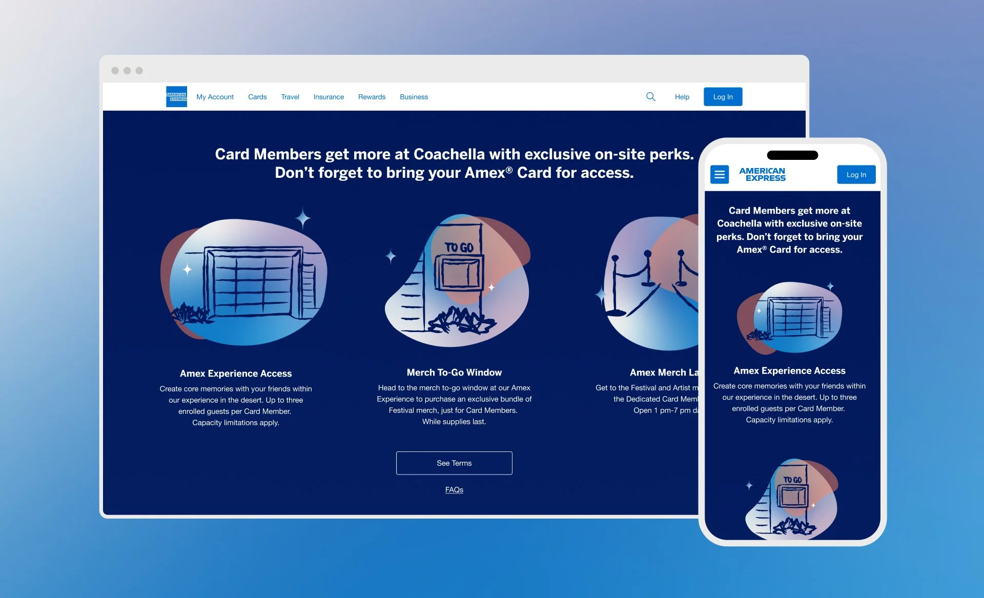 I led the design and execution of each landing page for the full suite of Amex’s music festival partnership portfolio, including Coachella, Stagecoach, Austin City Limits, and BST Hyde Park. This promotional hub showcases on-site perks for card members, and drives interest in Amex’s experiential marketing tie-in with the festival.